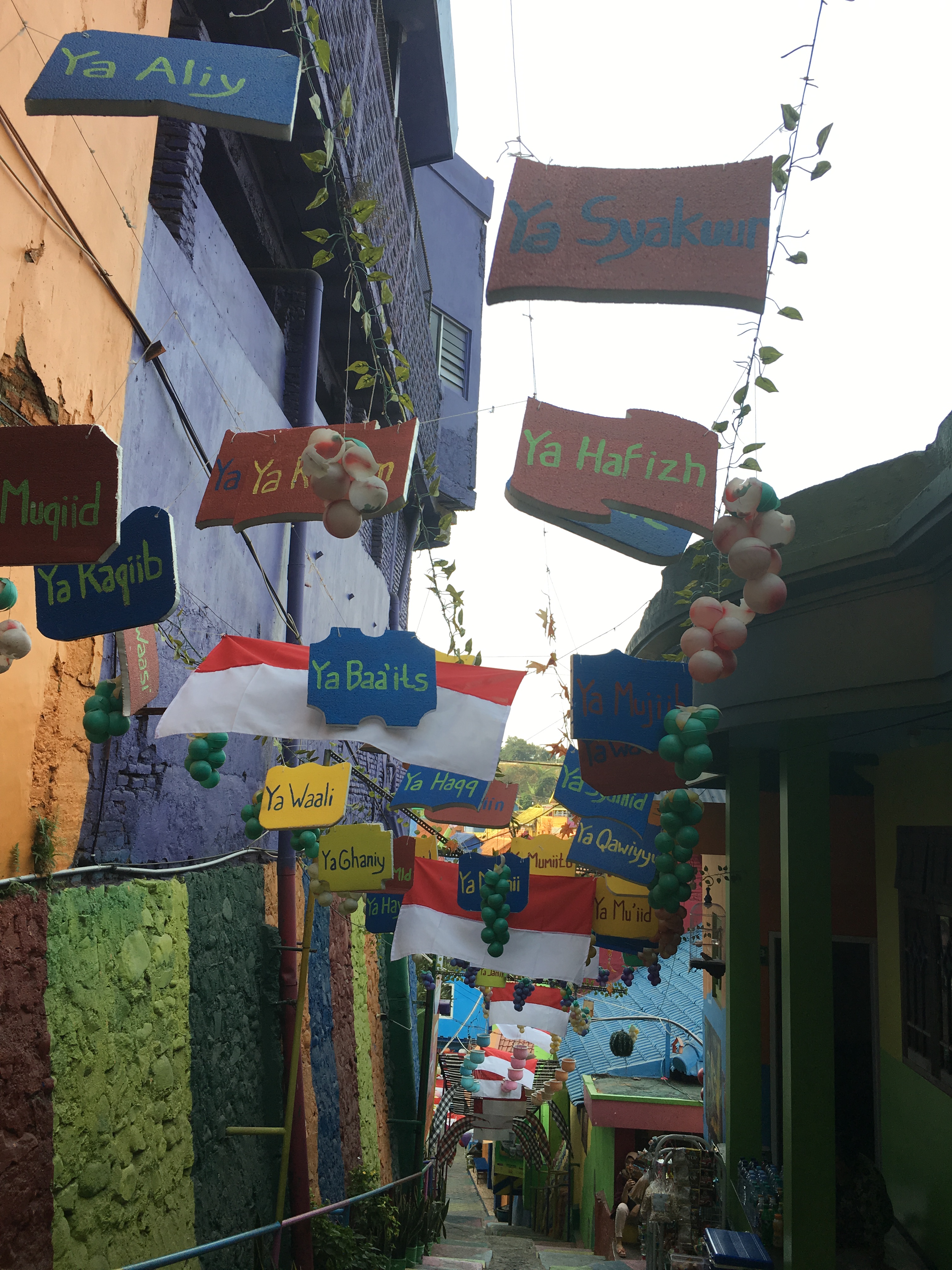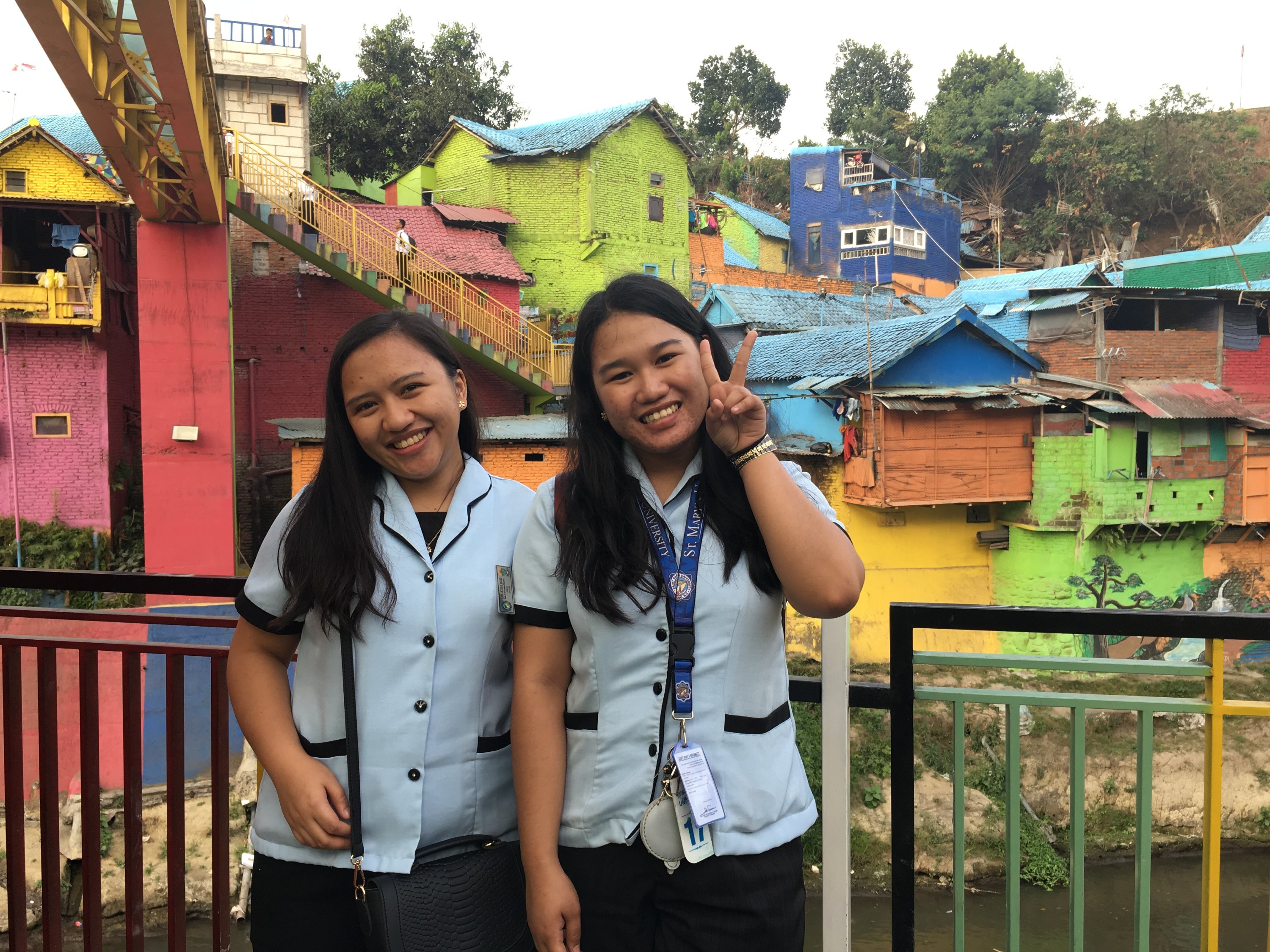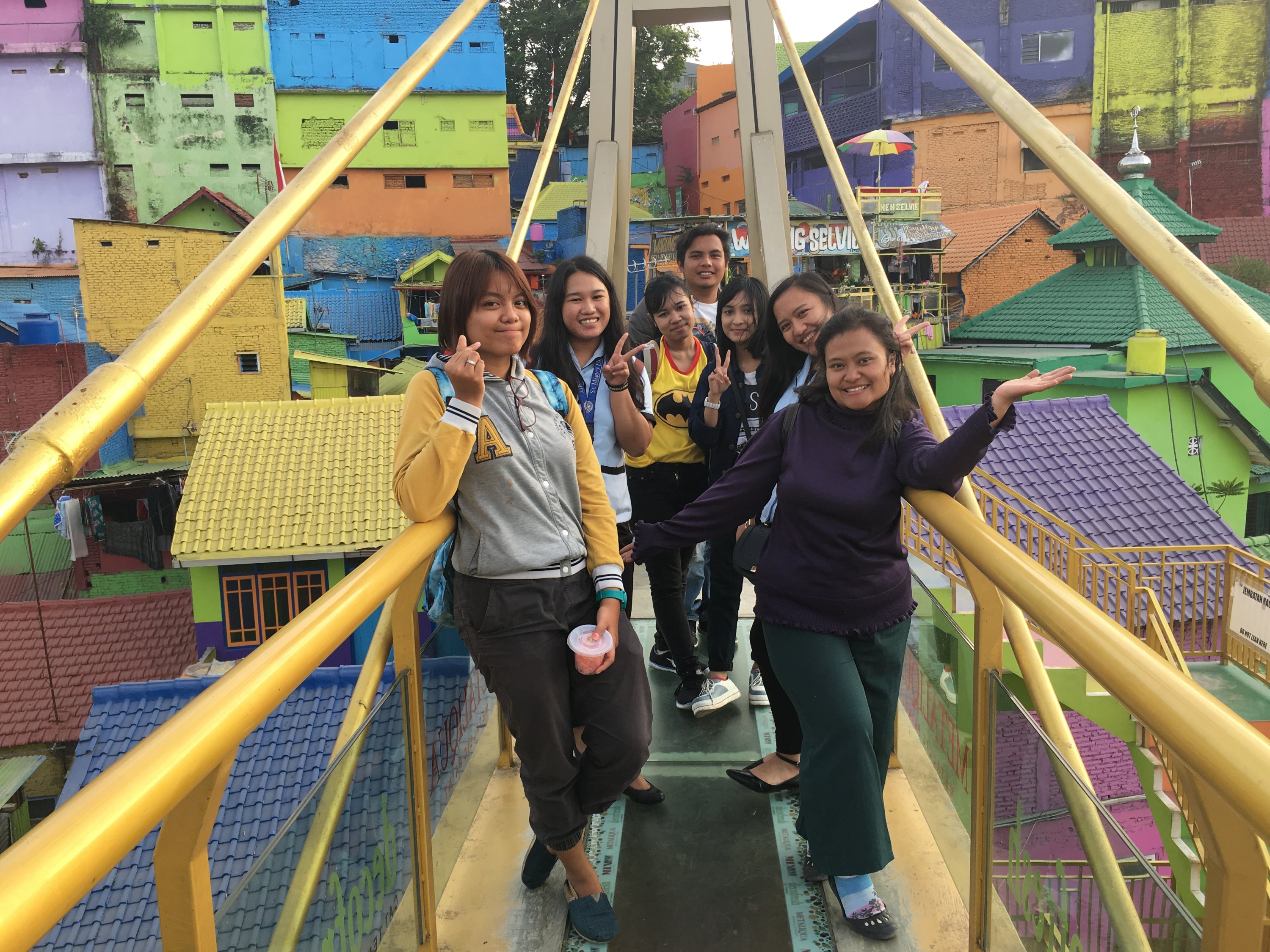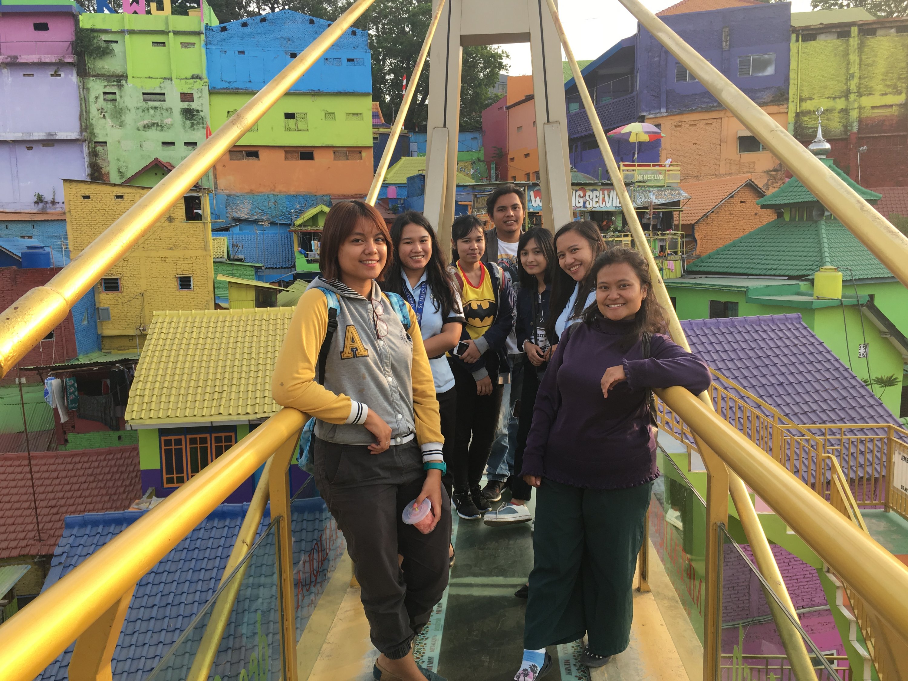 Right after the class on our first day in SMKN4 , our Unikama friends ,Vina and company fetch us from the School to gave us a tour around Malang. We rode to their motrcycle and I was shocked by how most people use motorcycle as their transportation and the road are mostly filled with motorcycles. Our first stop is Kampung Warna Warni Jodipan or the Village of Color. The roof of each houses were painted in different colors.And the walls were filled with artworks of the people there. Its a haven of artworks and color that showcase the creativity of the Arema (People of Malang).