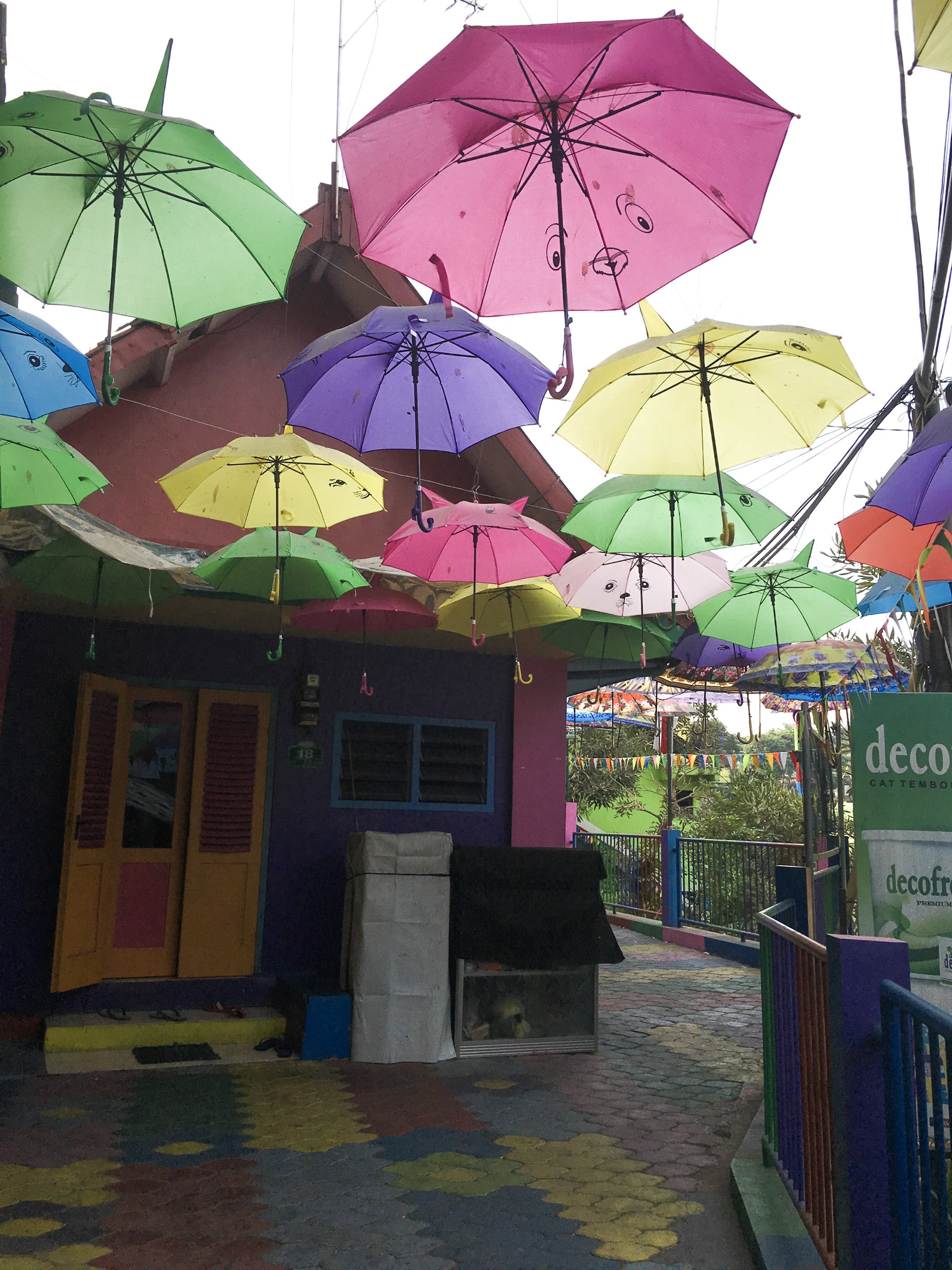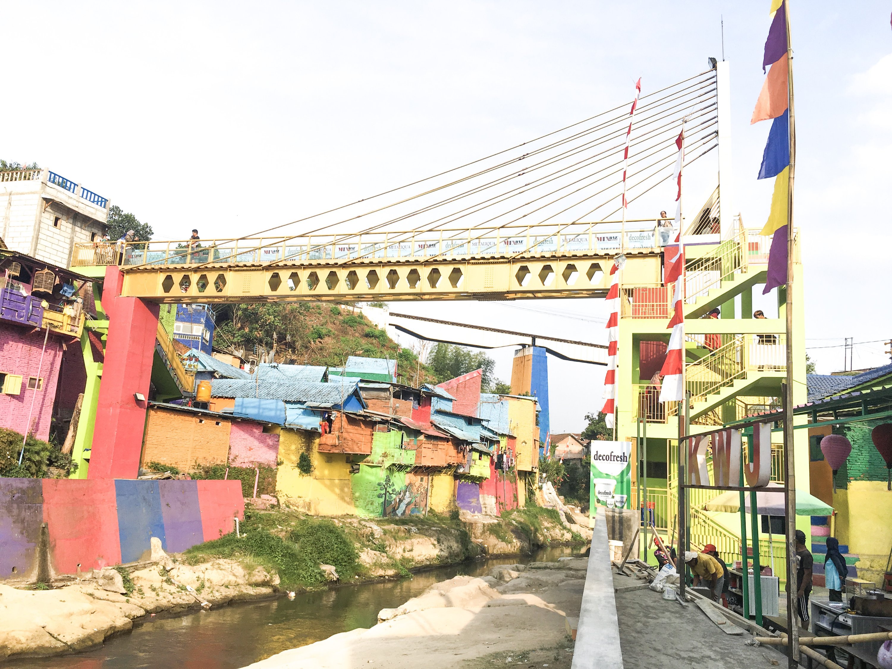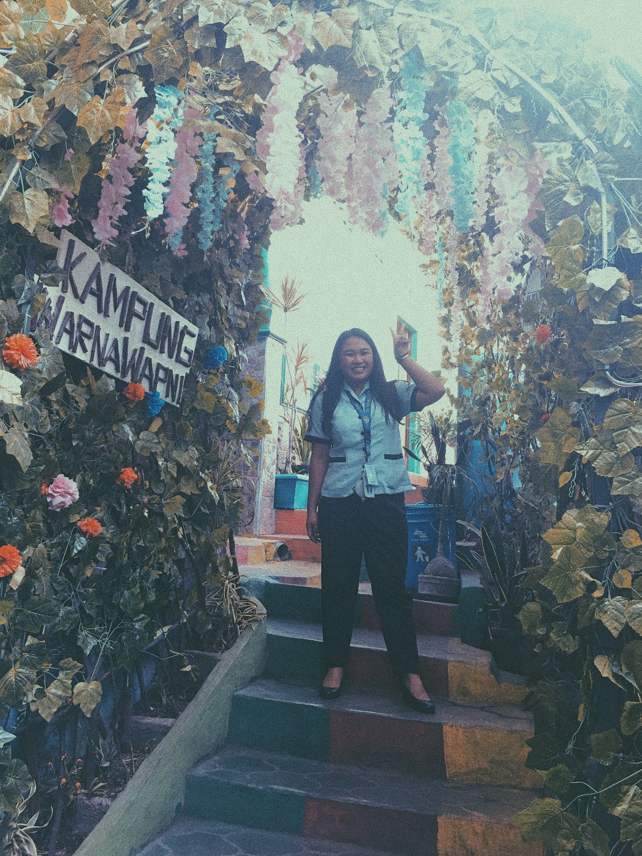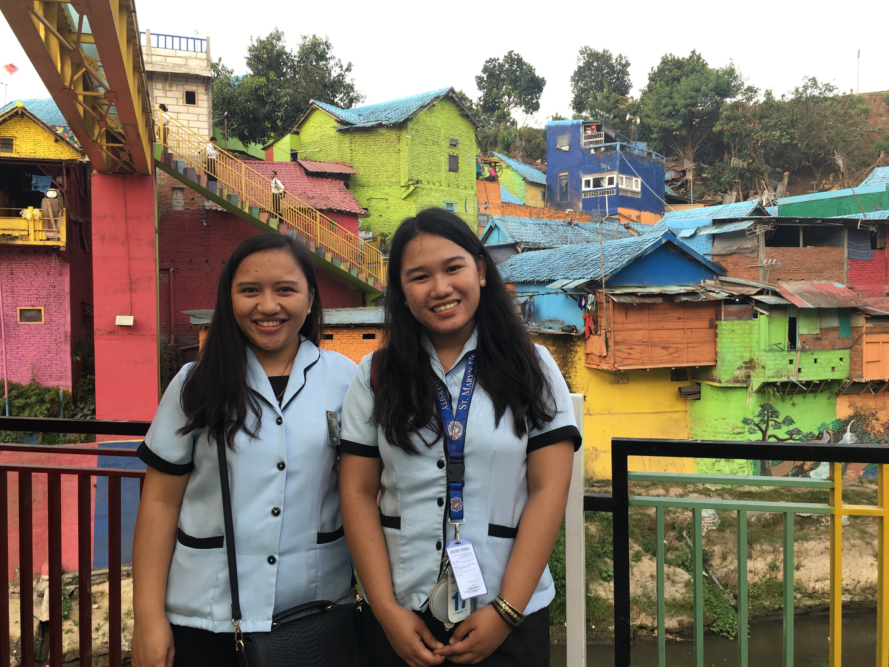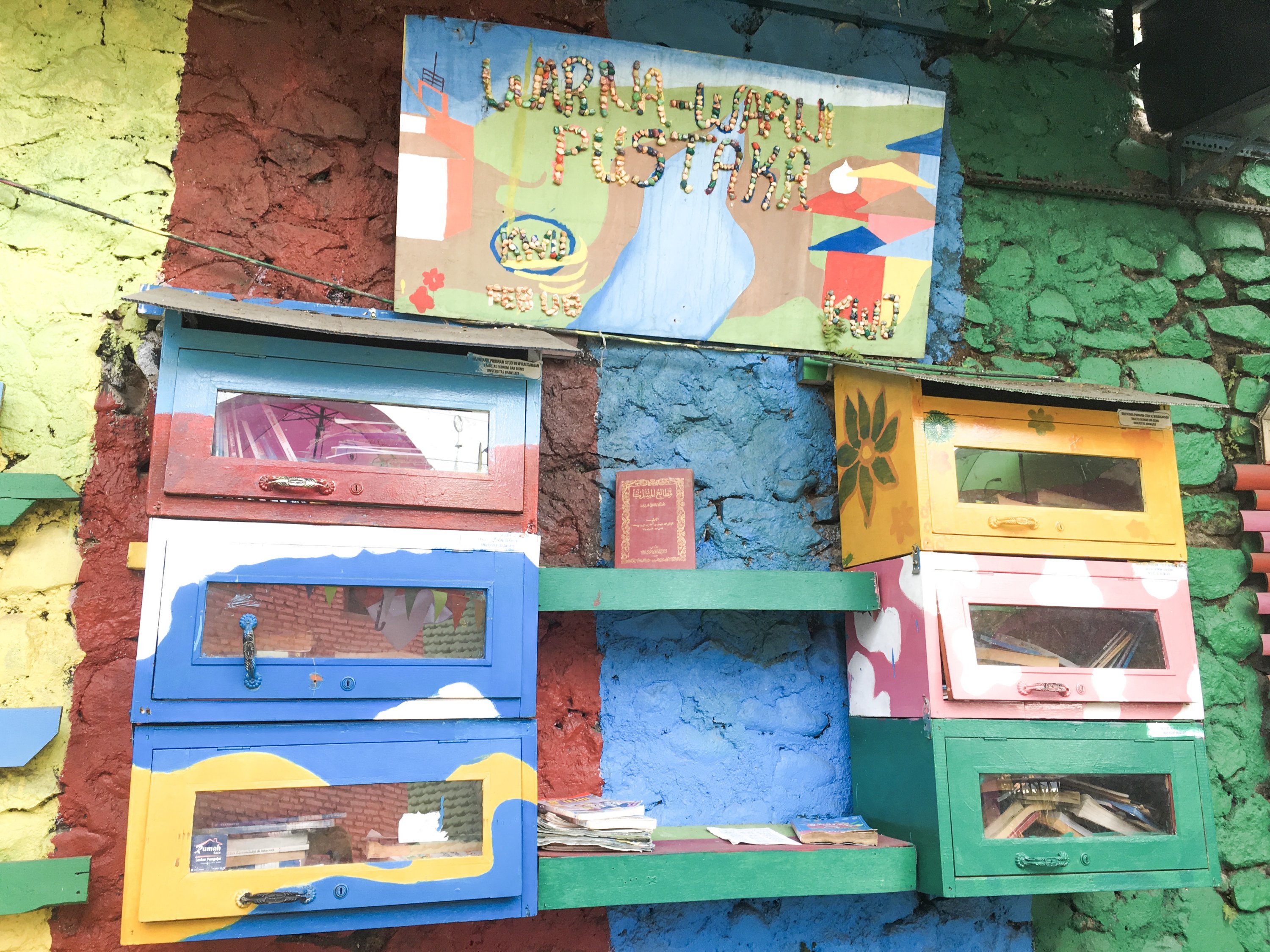 Right after the class on our first day in SMKN4 , our Unikama friends ,Vina and company fetch us from the School to gave us a tour around Malang. We rode to their motrcycle and I was shocked by how most people use motorcycle as their transportation and the road are mostly filled with motorcycles. Our first stop is Kampung Warna Warni Jodipan or the Village of Color. The roof of each houses were painted in different colors.And the walls were filled with artworks of the people there. Its a haven of artworks and color that showcase the creativity of the Arema (People of Malang).
