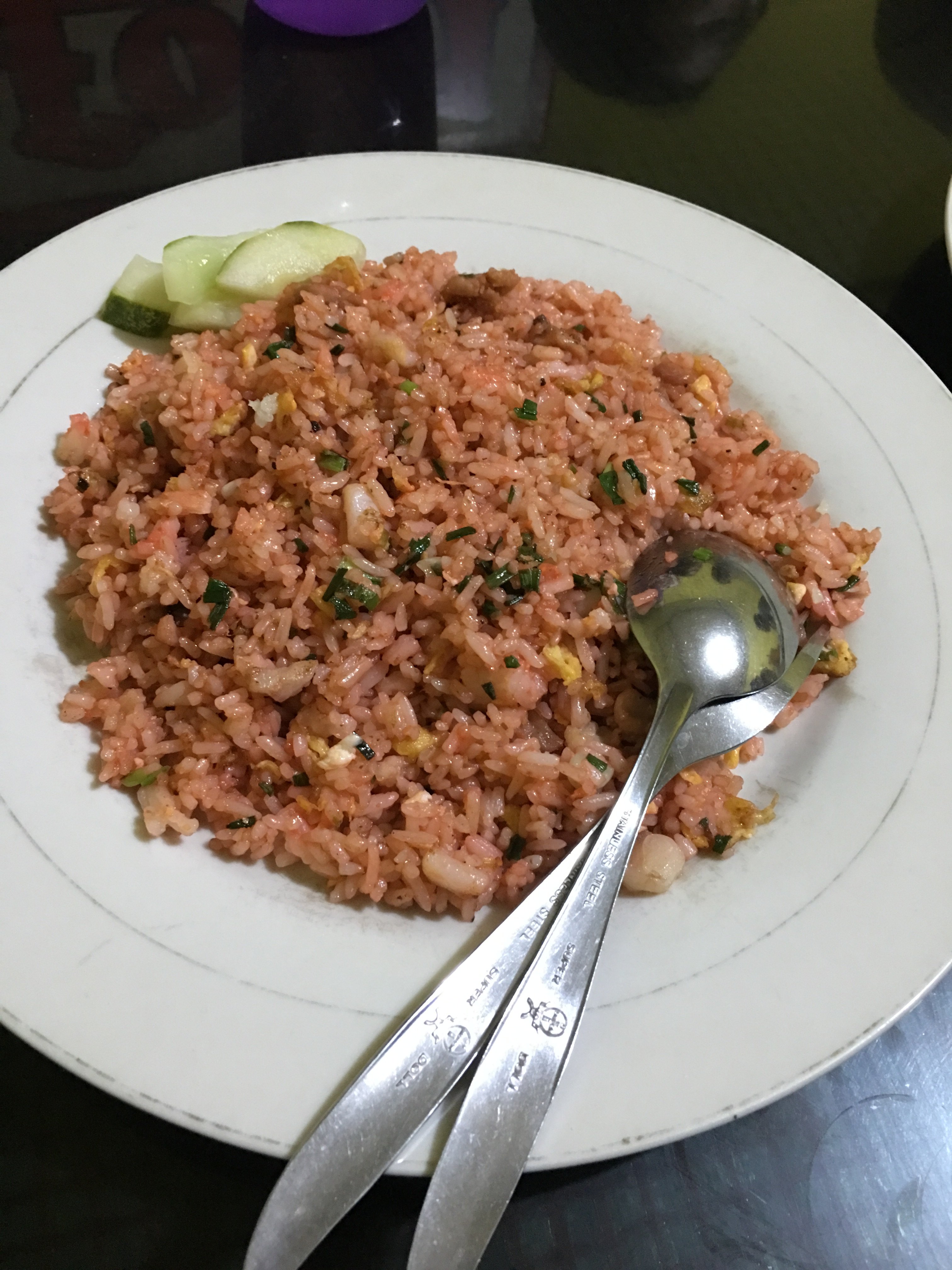 Nasi goreng , literally meaning “fried rice” in both the Malay and Indonesian languages, is an Indonesian rice dish with pieces of meat and vegetables added. It can refer simply to fried pre-cooked rice, a meal including stir fried rice in a small amount of cooking oil or margarine, typically spiced with kecap manis (sweet soy sauce), shallot, garlic, ground shrimp paste, tamarind and chilli and accompanied by other ingredients, particularly egg, chicken and prawns. There is also another kind of nasi goreng which is made with ikan asin (salted dried fish) which is also popular across Indonesia. Nasi goreng is sometimes described as Indonesian stir-fried rice, although it is also popular in Southeast Asia.